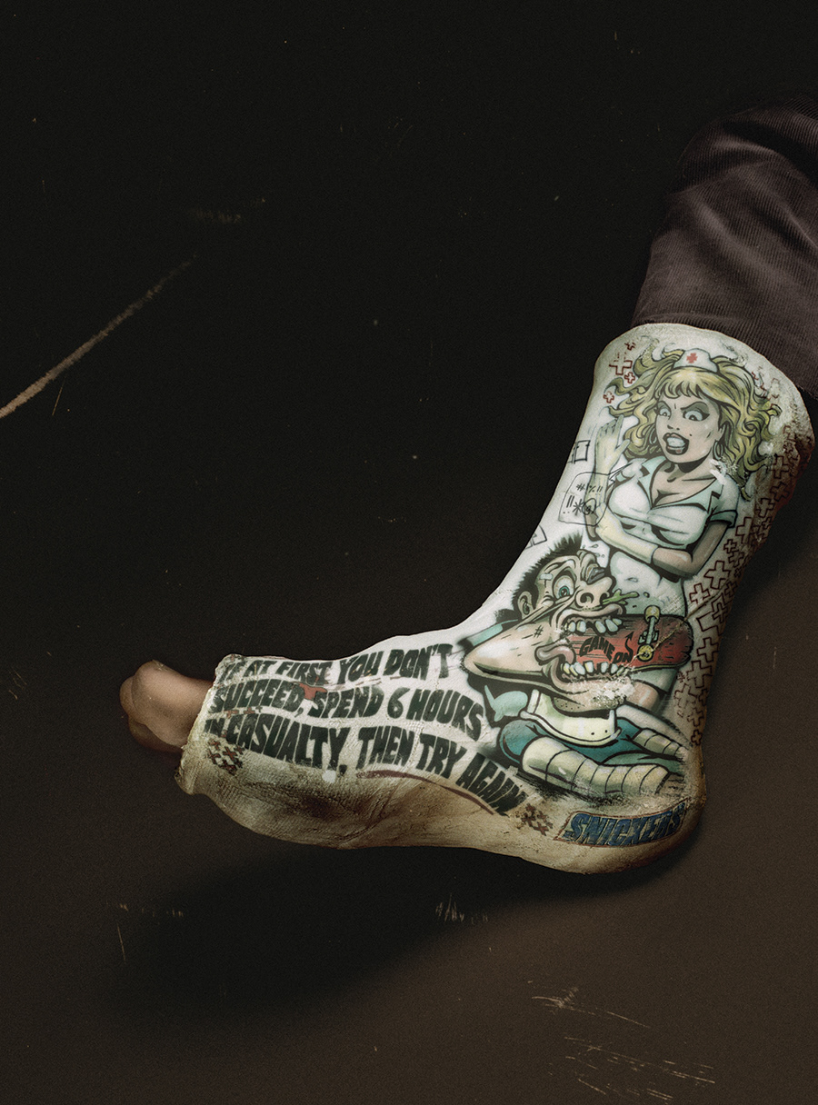 Pan-European ad campaign for Snickers to promote their skate event sponsorship. All graphics were produced by guest artists - Including myself and then collaborator Sleeba, as well as tattooist Jimbo Phillips and music illustrator Vince Ray, then placed onto the casts and helmets in post. Multiple award winner, including Cannes.